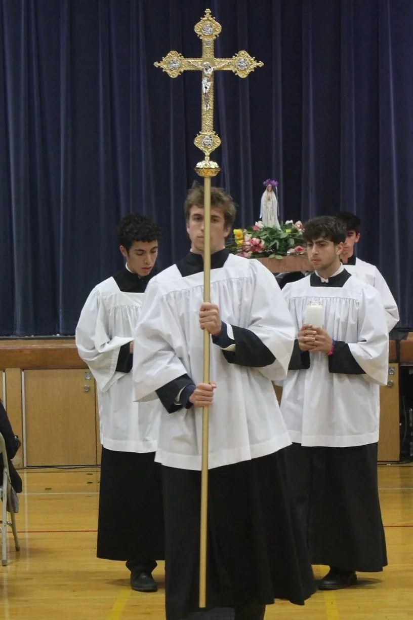 Mass is the heart of our students’ daily life at Chesterton Academy. Each school day, the entire student body comes together for the Holy Sacrifice of the Mass. Mass is celebrated daily at 9:20 a.m. We are deeply grateful to our School Chaplain, Fr. Andrew Buchanan, and the many priests who generously share their time, allowing us to offer daily Mass on campus.